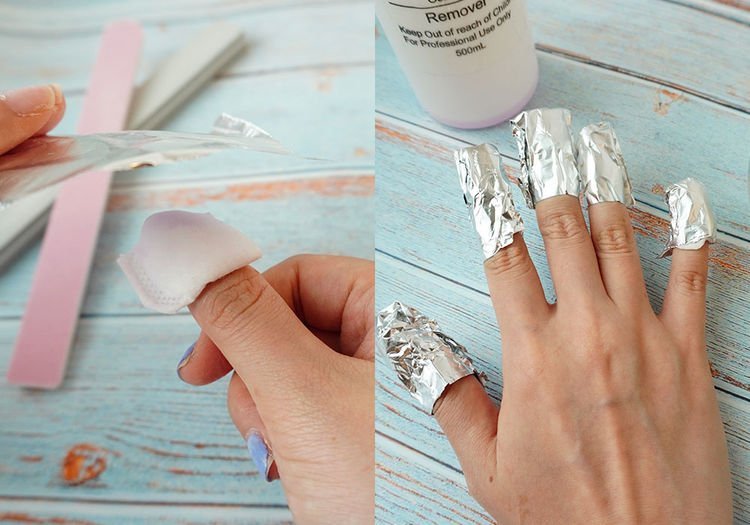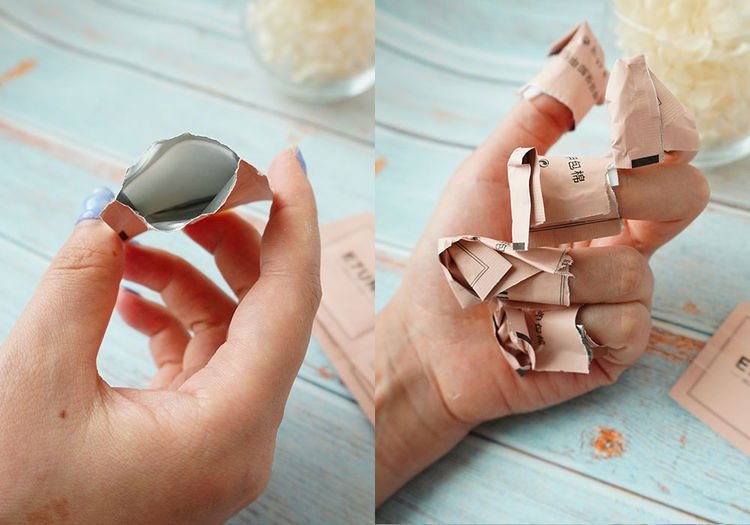 没有卸甲包的话,可将化妆绵剪到指甲大,再沾满卸甲水或去光水,敷在甲面上,外层用锡纸包裹甲面密封,避免卸甲水被挥发掉。