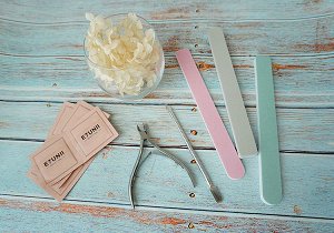 自己卸甲/拆甲工具包括光疗卸甲包、夹箝、推棒、粗磨棒、细砂磨棒和抛光棒。