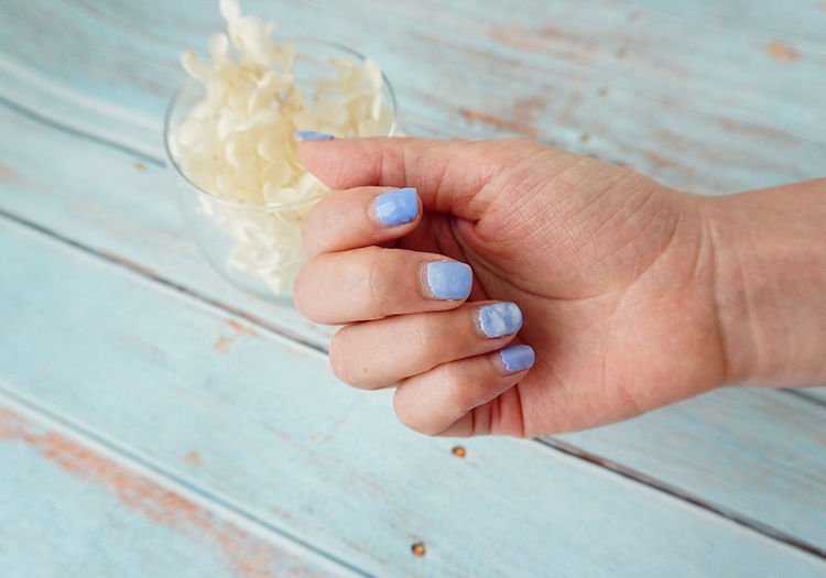 现成的卸甲包内含沾满了卸甲水的海绵,可直接包裹整个手指头,让卸甲水软化gel甲,通常待3分钟即可。
