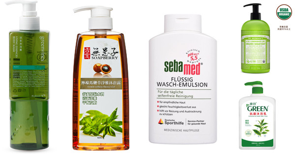 《绿藤生机》活萃沐浴露、《古宝》无患子柠檬马鞭草净雅沐浴露、《施巴》洁肤露、《布朗博士》柠檬草Shikakai沐浴露、《Green绿的》抗菌沐浴乳-绿茶精油。