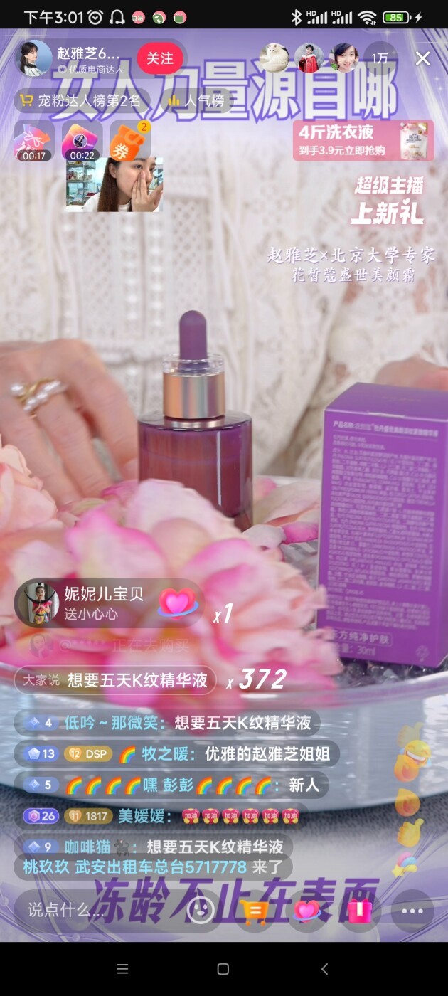 在长达1个小时的互动中,北大夫妇见证了赵雅芝抖音粉丝冲刺一千万、引领数十载盛名不衰的号召力;赵雅芝也向粉丝分享自己的“冻龄小秘诀”——花皙蔻“牡丹抗老盛世美颜霜”,可轻松消除法令纹、鱼尾纹和颈纹。同时,她也对这款产品的使用体验和抗老效果给予了客观点评。