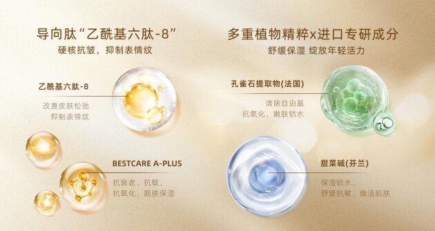 此次推出的素养抗皱精华乳在配方上,采用了智能肽强化,能够主动靶向修护皮肤需要区域,直接释放有效成分,使其功效比其他产品高出60%。通过智能检测保护细胞、抑制表情肌收缩,从而能够显著淡化皱纹、抵抗衰老。