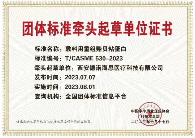 贻贝粘蛋白具有优越的生物学特性,其成膜粘附、促进愈合、细胞保护等多种特点和优势,使其可以在严肃医学及功效护肤等领域广泛使用。但传统的天然贻贝粘蛋白获取效率低,且原料来源存在被污染的风险。绽妍生物创新地利用基因工程技术,以微生物为宿主菌经发酵纯化等工艺研发生产出重组贻贝粘蛋白,其纯度达到医用级生物材料标准,大幅提升原料功效性及安全性,且大大降低了该原料的生产成本。 2023年8月1日,由绽妍生物旗下研发平台德诺海思牵头起草的《敷料用重组贻贝粘蛋白》团体标准正式实施,这标志着国内敷料用重组贻贝粘蛋白走上行业标准化道路。