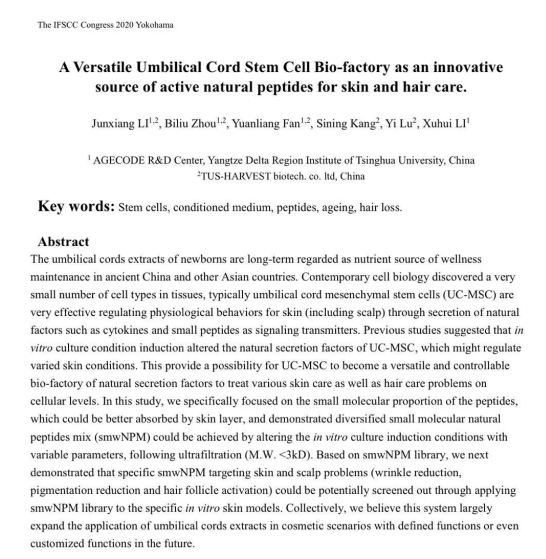 清华长三角研究院衰老科学创新研发中心(AGECODE R&D CENTER, 简称ACRDC)在本次会议上发表了会议论文和学术海报—《A Versatile Umbilical Cord Stem Cell Bio-factory as an innovative source of active natural peptides for skin and hair care.》作为浙江清华长三角研究院与启迪禾美生物科技有限公司联建的研发转化中心,ACRDC拥有7位业界资深专家组成的科学顾问团,其中首席科学顾问由2013年的诺贝尔奖得主Michael Levitt担任,截至目前,ACRDC已经成功研发获得包括能有效促进皮肤祛皱抗衰、美白以及毛发再生在内的10余种天然和合成活性肽组合成分,并不断优化配方与剂型工艺,实现核心技术的不断创新,自主申请30余项自主知识产权。