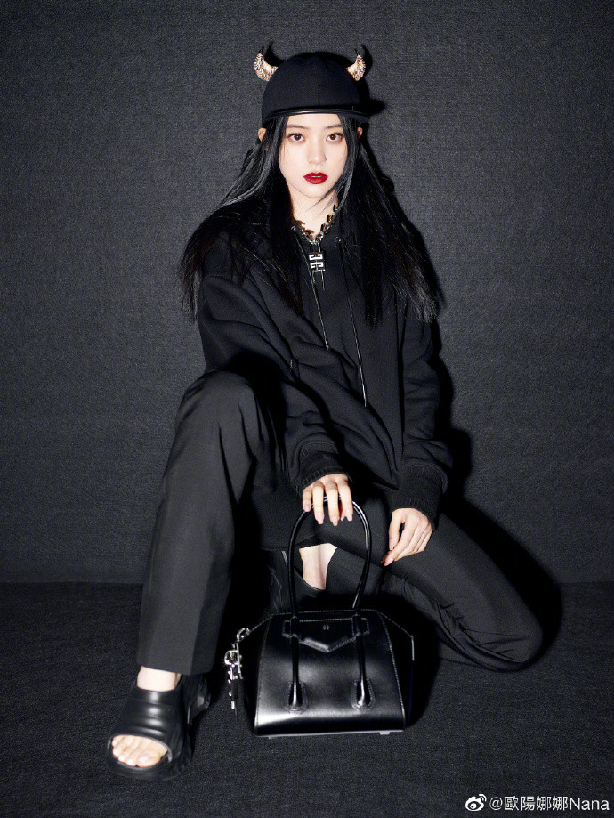 欧阳娜娜身上全套服装来自GIVENCHY 2021春夏最新系列,黑色的卫衣上利用特殊拉链口袋设计点出细节,与脚上的厚底拖鞋搭配营造出街头前卫风格,手上的小型ANTIGONA手袋则是近期时尚圈曝光率超高的爆款,接著看到娜娜头上一眼就能吸住目光的“羊角帽”,辨识度极高,成为粉丝们讨论的焦点,“羊角很酷!”、“小恶魔好可爱。”、“我的小牛。”各种联想都有,甚至有网友提出疑问:“牛魔王?”